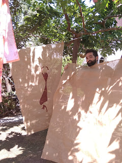 Por la tarde seguimos trabajando en los proyectos, dándonos un manguerazo de vez en cuando. Yo estaba ya con la última obra, Marijose terminaba otro de sus libros y Bartolomé había cosido ya todas las telas comenzaba a pintar el interior de las siluetas con almagra.